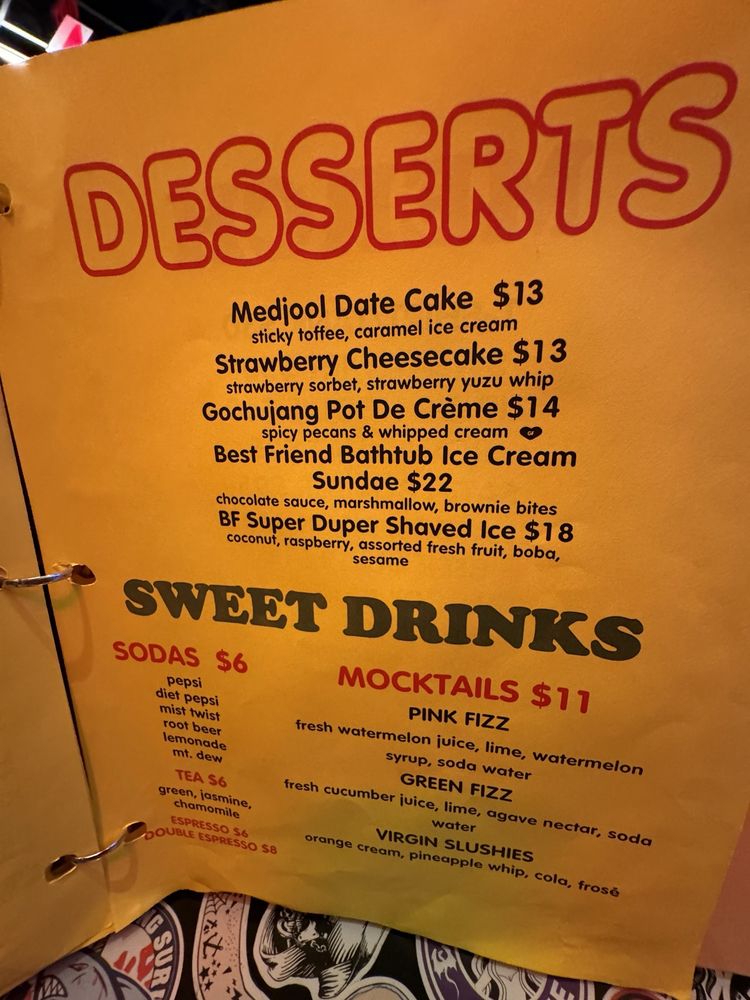 Introducing the menu at Best Friend by Roy Choi, located in Las Vegas, is a culinary experience that combines traditional Korean flavors with a modern twist. The kimchi fried rice is a highlight, with fresh and crispy textures that tantalize the taste buds. The uni dynamite and crispy shrimp are also crowd favorites, bursting with bold and flavorful sauces. The fusion of Korean and Mexican influences creates a unique palate experience, perfect for those seeking something new and exciting. The ambiance is vibrant and hip, with quirky front decor and a trendy back area. Service is attentive and friendly, adding to the overall enjoyable dining experience. Don't miss out on the Chef Menu for a full culinary journey through the innovative dishes at Best Friend.